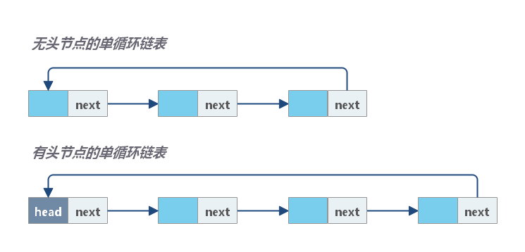 next 指向空地址。next 指向第一个节点(如果有头节点,就指向头节点)。