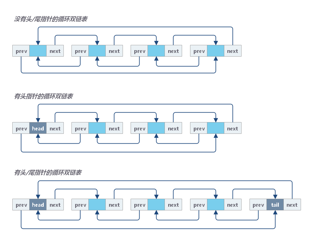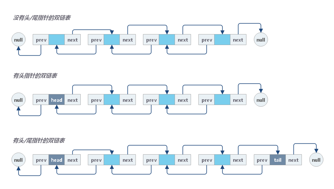 与单链表不同,使用 prev 字段可以很容易地在常量时间内获得前一个结点。
