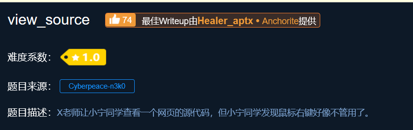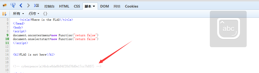 从题目名即可看出,这题是从网站源代码中查看flag,而鼠标右键又被禁止了。所以我们可以想到用F12来查看网站源代码。如下图可轻松得出FLAG