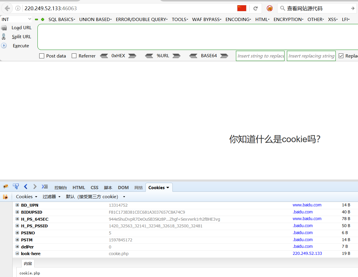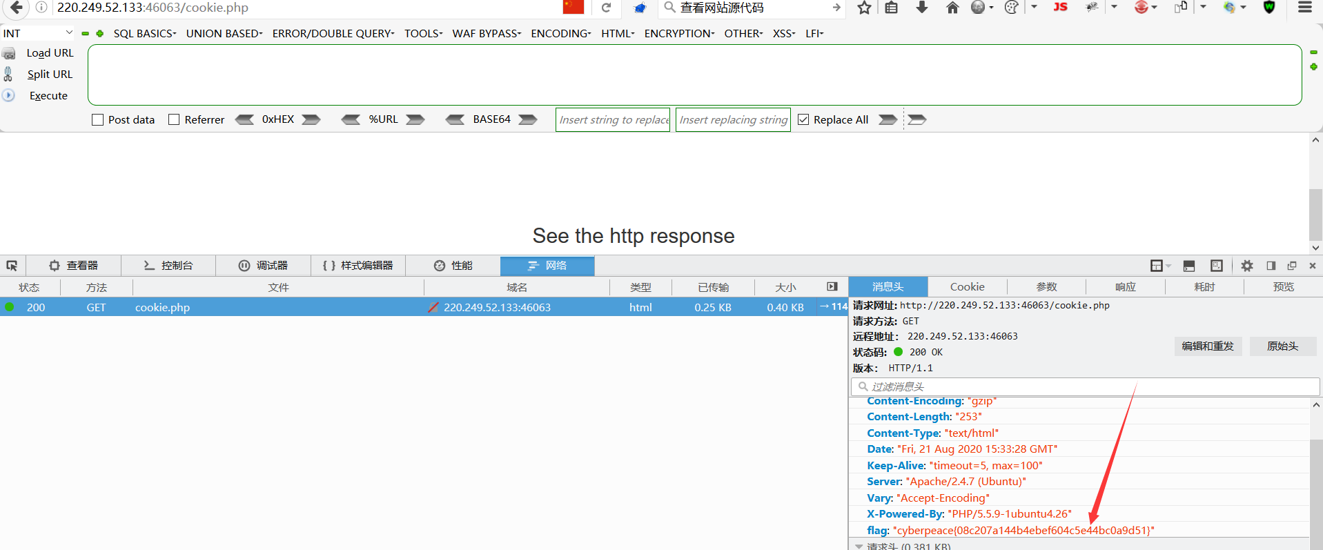 看到cookie直接一手F12打开cookie选项框,下拉发现个cookie.php,访问过后提示说see the response 这就是让我们看返回数据包。所以我们查看数据包即可获得FLAG