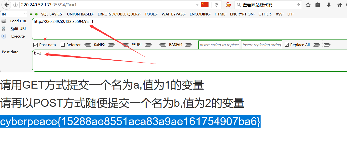 从该题目及描述可看出,这道题是让我们利用get和post俩种方式发出请求得出FLAG。这里我们就可以利用hackbar来发送请求。如下图