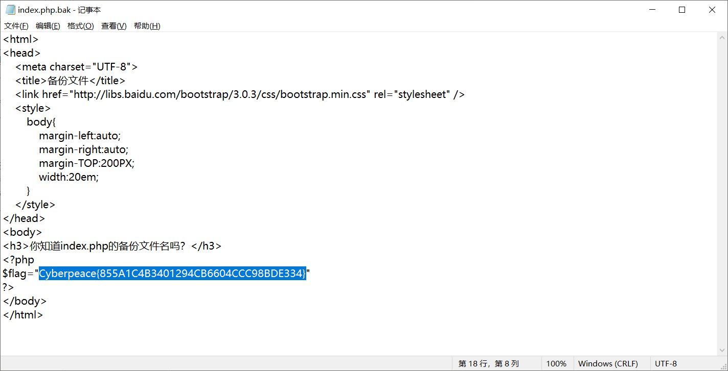 题目描述:X老师忘记删除备份文件,他派小宁同学去把备份文件找出来,一起来帮小宁同学吧! 打开靶场,发现其是要找index.php的备份文件。而我们知道备份文件名后缀为.bak所以我们直接访问index.php.bak。然后用文本打开文件即可得flag