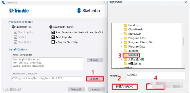 6. ①点击"Change...“;; ②建议安装在除C盘以外的盘符(这里我选择的是D盘,然后点击”新建文件夹"; ③命名为"SU2023"或者"SketchUp2023"; ④点击"确定"即可;