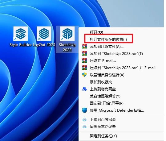 12. 桌面找到SketchUp 2023图标,然后右键选择“打开文件所在位置”;