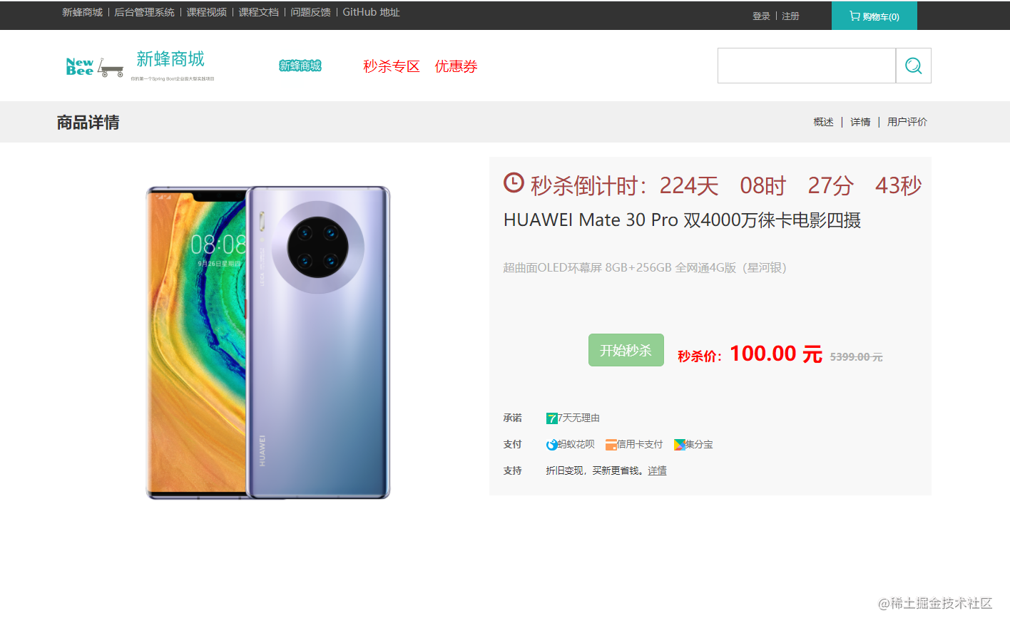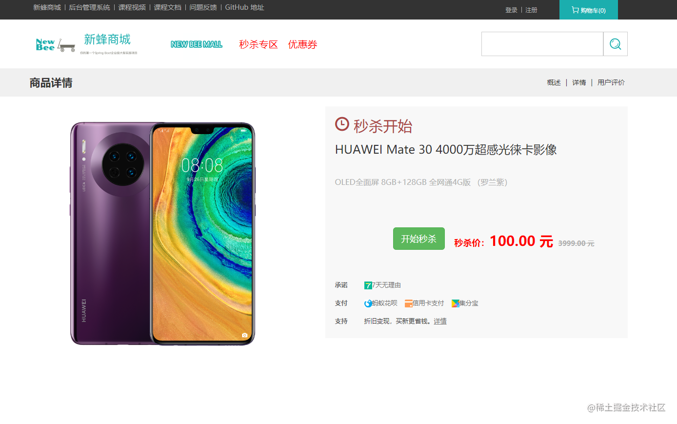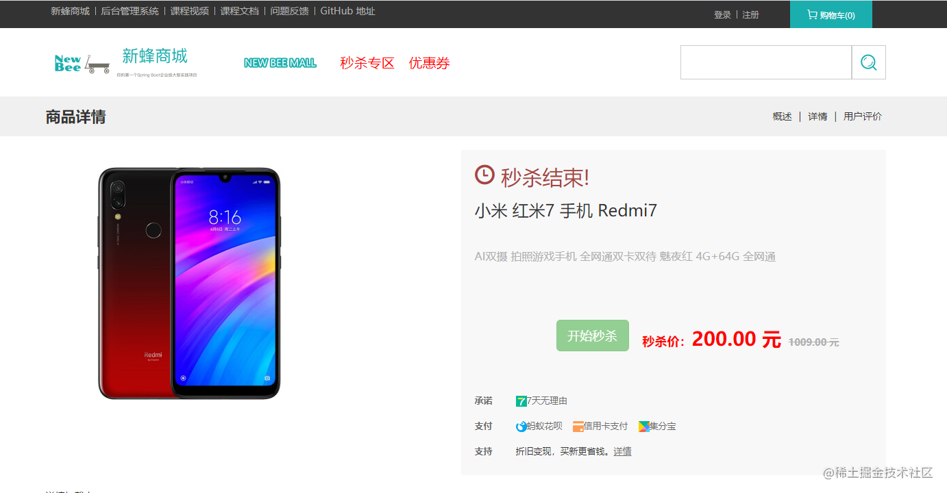 秒杀专区为用户展示了后台设置的秒杀商品,在秒杀有效期内可以进行商品秒杀操作. 秒杀接口使用了接口限流、Redis以及储存过程提高秒杀操作的tps
