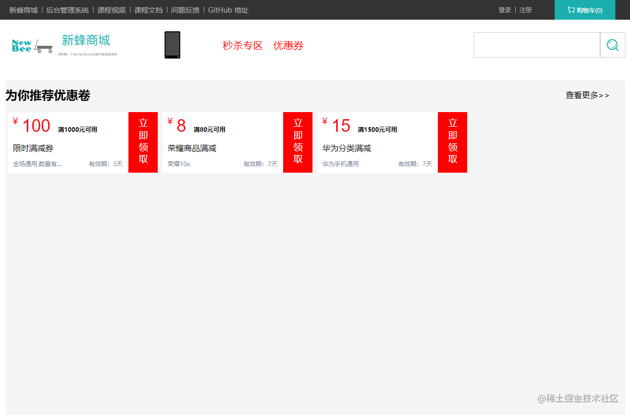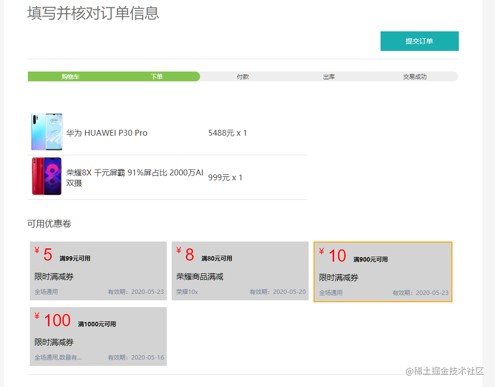 优惠劵页面为用户展示了后台设置的可用优惠劵,在下单时可以使用优惠卷减少下单金额