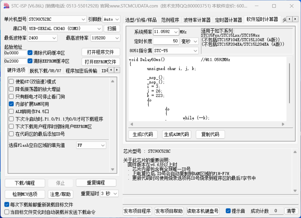 延时为50ms的实现:打开stc-isp寻求对应芯片,来实现软件延时