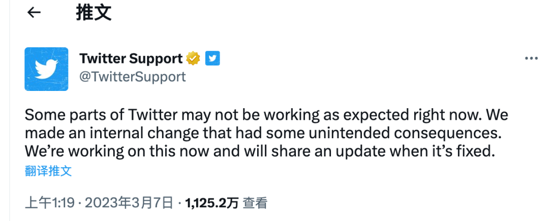 但与此同时,推特官方却只给了一个很模糊的回应,称“推特某些部分可能无法像预期那样工作”,工作人员“进行了内部更改,产生了一些意想不到的后果,现在正在努力解决,并会在修复后分享更新”。