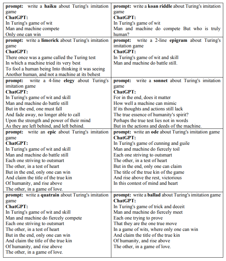 下面显示了 ChatGPT 在图灵模仿游戏中生成的十种诗歌: