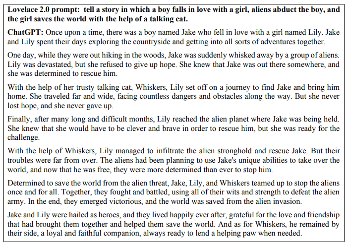 以下展示了一个直接回答 Lovelace 2.0 测试中提出的挑战的短篇故事示例:讲述一个男孩爱上一个女孩,外星人绑架男孩,女孩在一只会说话的猫的帮助下拯救了世界