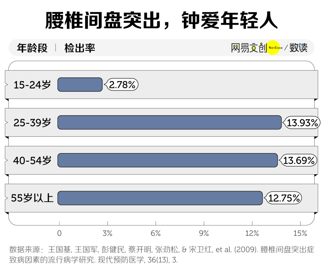 看似不起眼的腰痛,正在暗中成为中国人的“健康杀手”。与此同时,腰突也不再是老年人的专利,20 - 59 岁中青年人群中,腰痛发病率高达 19.6% [2]。