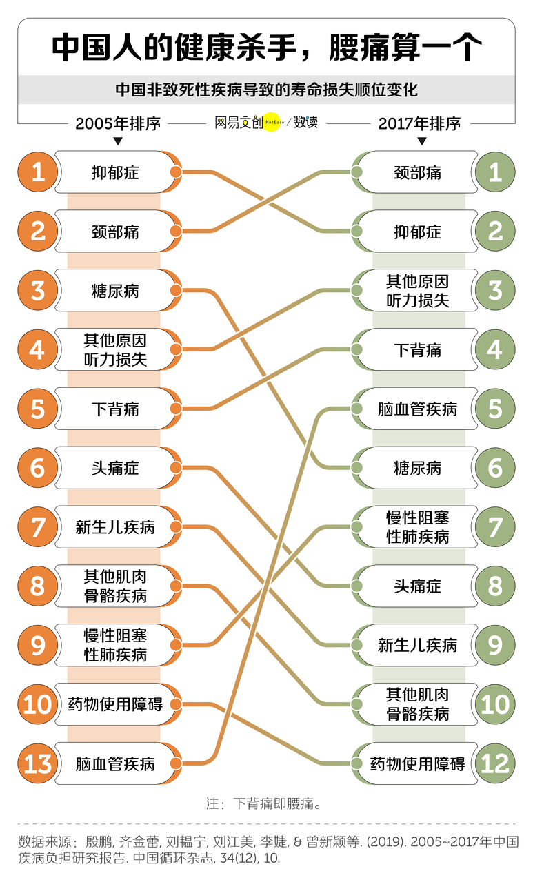 国家疾病防控中心发布的研究显示,在 2017 年非致死性疾病导致寿命损失的排行中,腰痛排名第四,仅次于抑郁症、颈部疼痛和其他原因听力损失,较 12 年前排名有所提升 [1]。