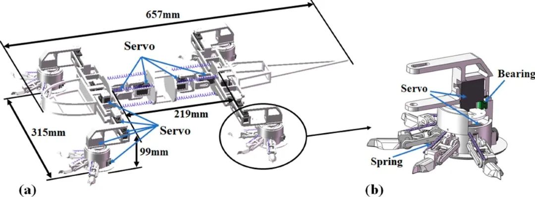为了复制蜥蜴典型的“爬行”动作,机器人的腿部结构采用四连杆机构,确保稳定的提升运动;脚由一个活动的脚踝和一个圆形垫子组成,脚上有四个灵活的脚趾,可以有效地抓住土壤和岩石。