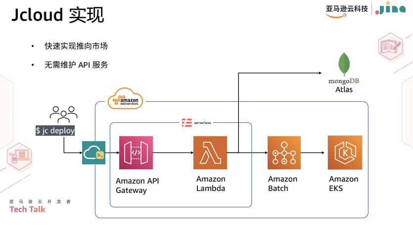 JCloud 的实现逻辑如下图所示。JCloud 是一个 Python 包,安装后开发者可以直接使用 "JCloud deploy" 命令来运行对应的 Flow。该命令将向 API 发送一个请求。API 依然使用的是 Serverless 的方式,和控制台构建的方式类似,同样使用 Amazon API Gateway 和 Lambda Function 进行构建。一些比较重的任务会直接交给 batch job 处理,而轻的任务,如查询已部署的服务,则由 Lambda Function 自己处理。最后,服务将部署在 Amazon EKS 上。