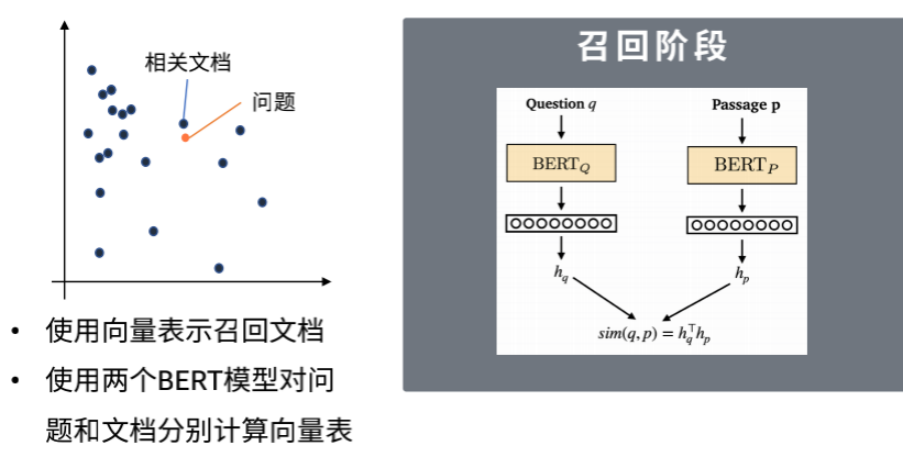 在两阶段方法的基础上,端到端方法进行了召回阶段的提升。从模型上看,端到端方法依旧是分为召回和阅读理解两个阶段,区别在于,它使用了向量检索的方式来替代传统的检索技术用于召回。用向量去召回是指将所有文档通过一个映射函数映射到一个空间中,这个空间可以是二维的。同样地,当用户提出一个问题时,可以将这个问题映射到同样的二维空间中。在这个二维空间中,可以找到与问题语义相似的文档,因此可以将这些文档召回作为答案的候选项。与传统的关键词匹配不同,这种方式可以通过语义相似性来匹配文档,从而提高召回率。