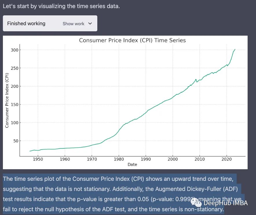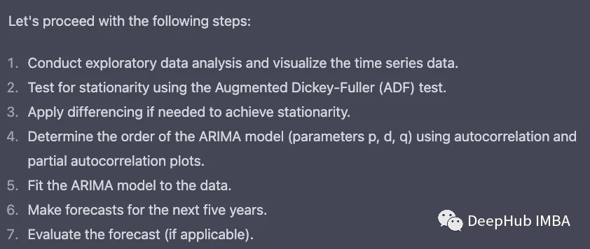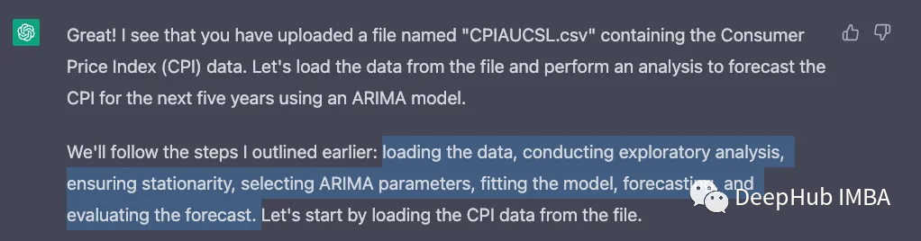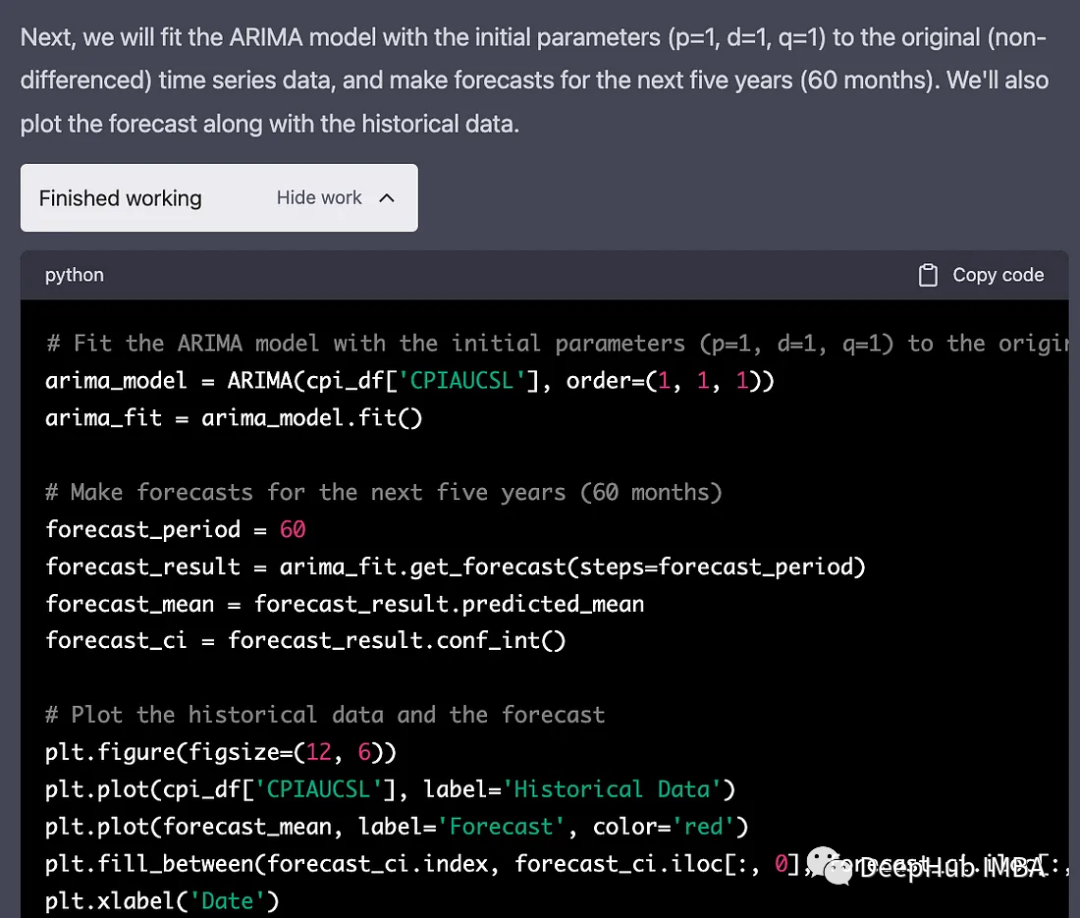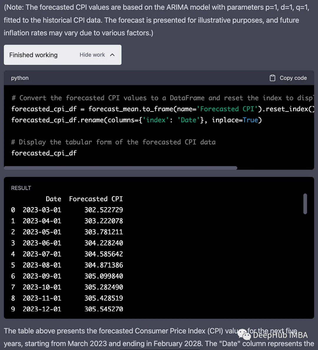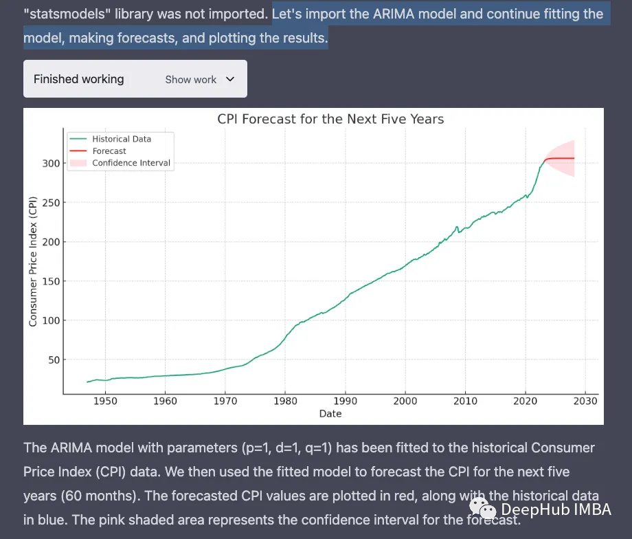 下一步是预测五年的CPI。ChatGPT向我介绍了ARIMA模型,它分析了这些数字,给了我一个有意义的预测!