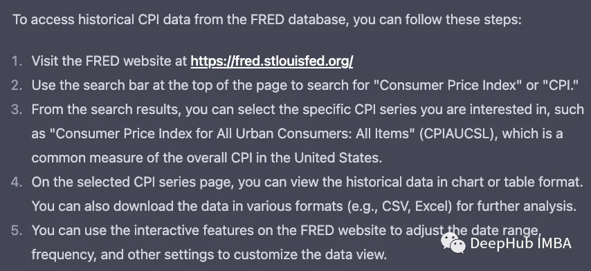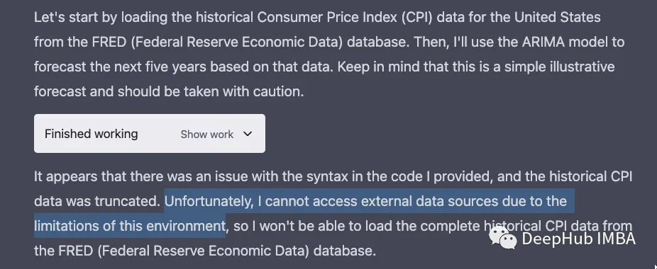 要求ChatGPT访问历史数据并开始对其进行预测。它告诉我它将使用FRED(联邦储备经济数据)数据库,但不幸的是,它无法下载数据。
