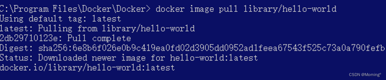 docker image pull library/hello-worldocker image pull是抓取 image 文件的命令library/hello-world是 image 文件在仓库里面的位置library是 image 文件所在的组hello-world是 image 文件的名字。官方提供的 image 文件,都放在[library](https://hub.docker.com/r/library/)组里面,所以是默认组,可以省略。简化写法: