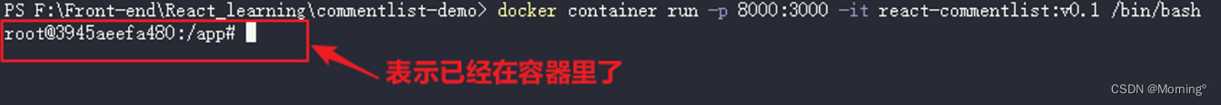 p参数:容器的 3000 端口映射到本机的 8000 端口。it参数:容器的 Shell 映射到当前的 Shell,然后你在本机窗口输入的命令,就会传入容器。react-commentlist:v0.1:image 文件的名字(如果有标签,还需要提供标签,默认是 latest 标签)。/bin/bash:容器启动以后,内部第一个执行的命令。这里是启动 Bash,保证用户可以使用 Shelldocker container run -p 8000:3000 -it react-commentlist:v0.1 /bin/bash