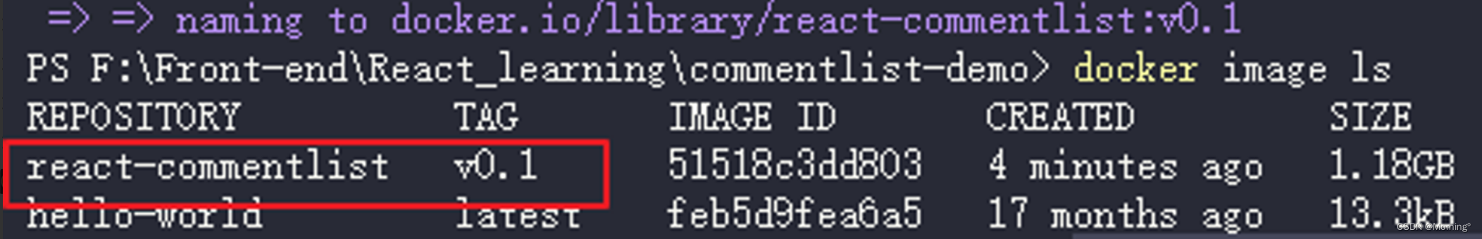 EXPOSE 3000docker image build -t react-commentlist:v0.1 **.**查看本机所有image,就能看到我们新建的image啦!