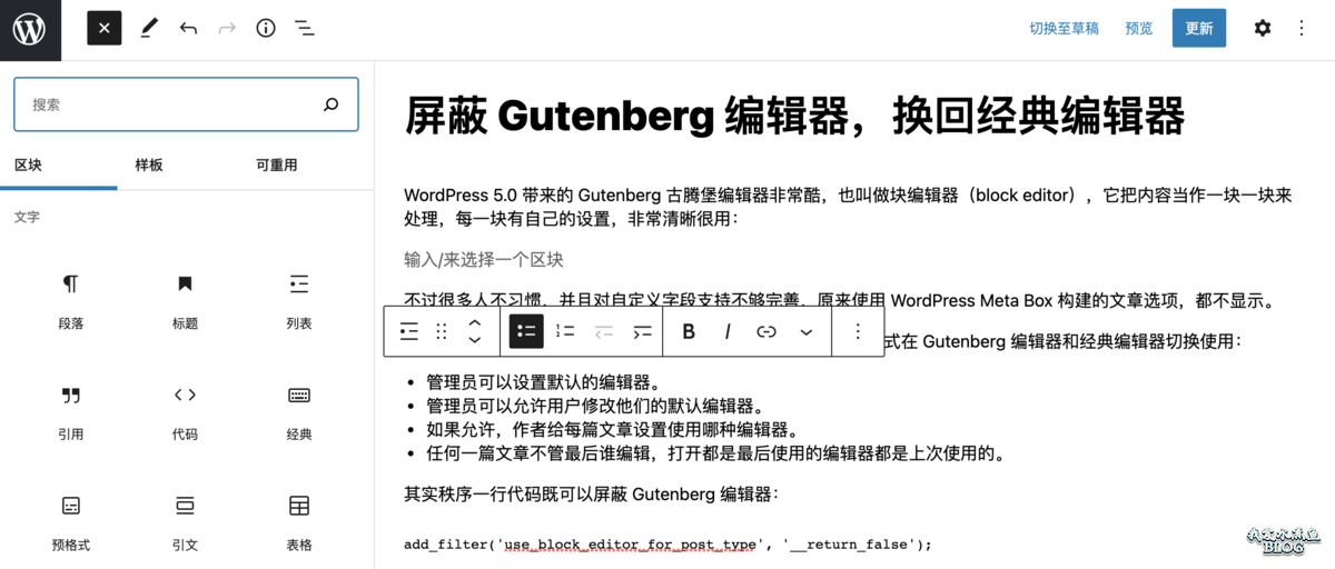 但是习惯是一件很难改变的事情,很多人习惯了经典的编辑器,对于古腾堡编辑器总是用不习惯。