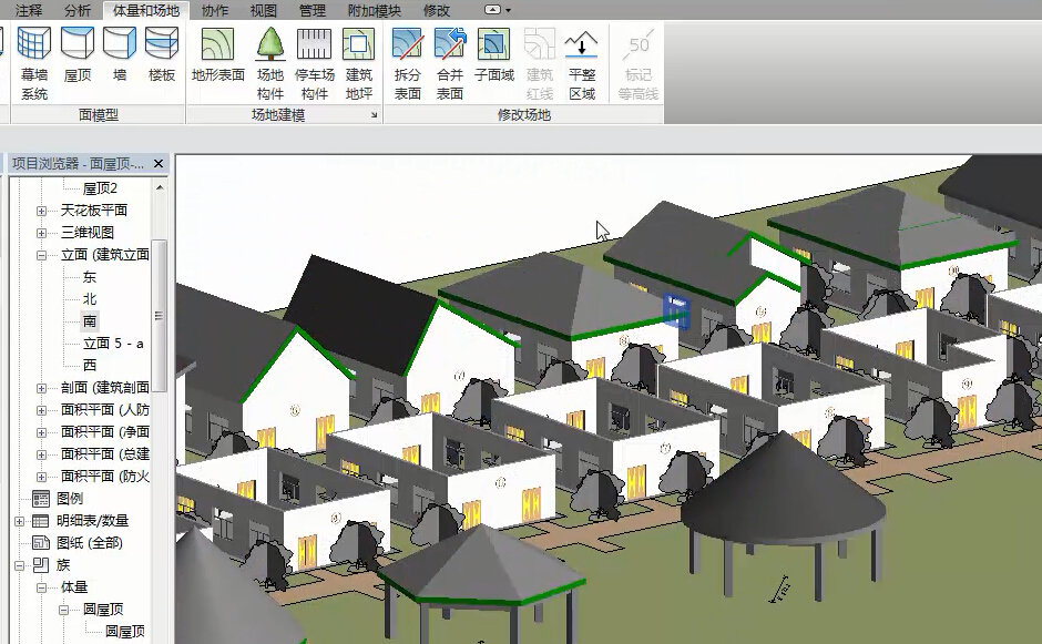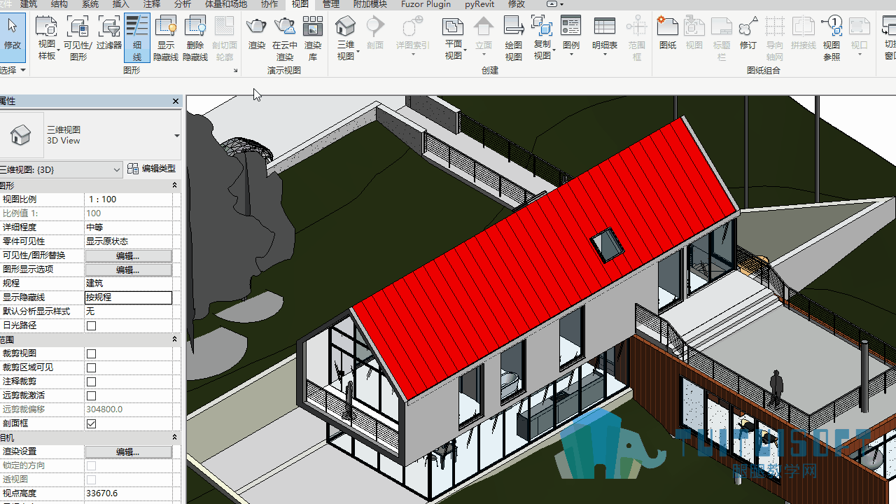 (3)创建屋顶:在 Revit 软件中,通过选择屋顶工具,可以很容易地创建屋顶形状,并设置屋顶材料和厚度。