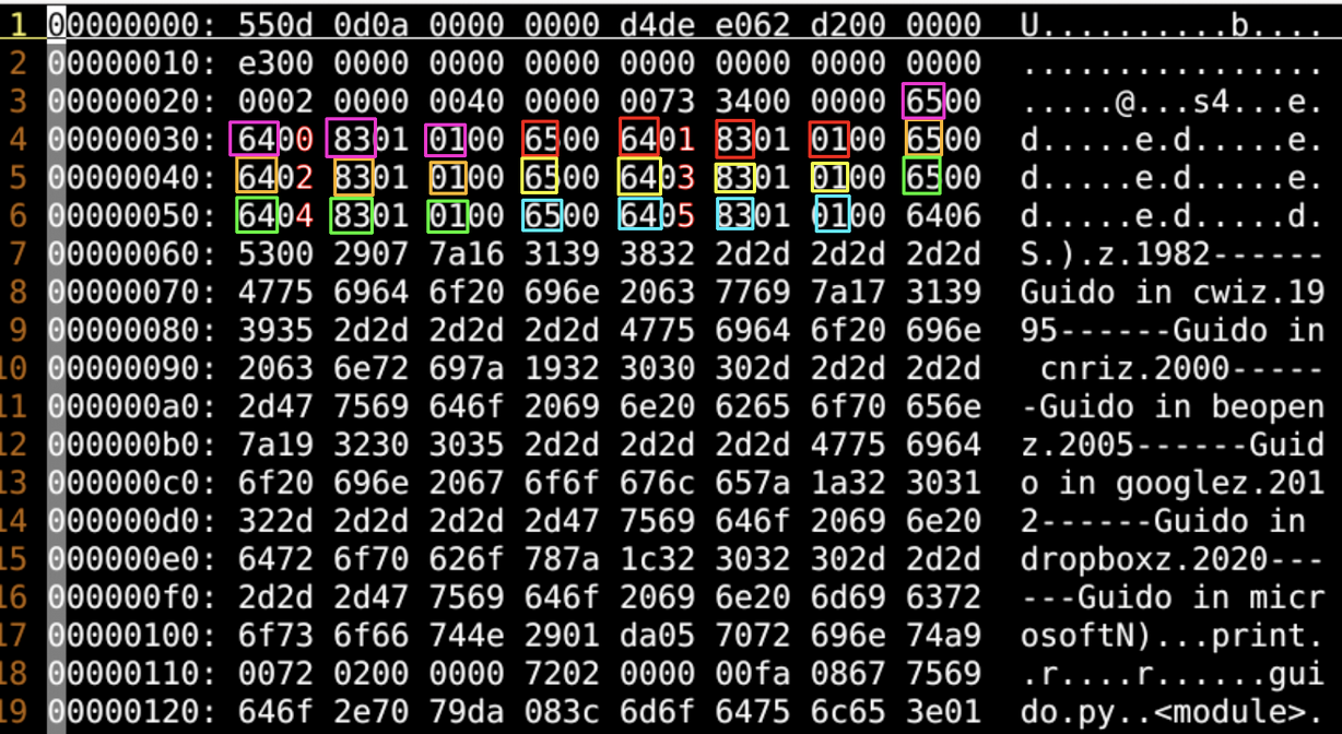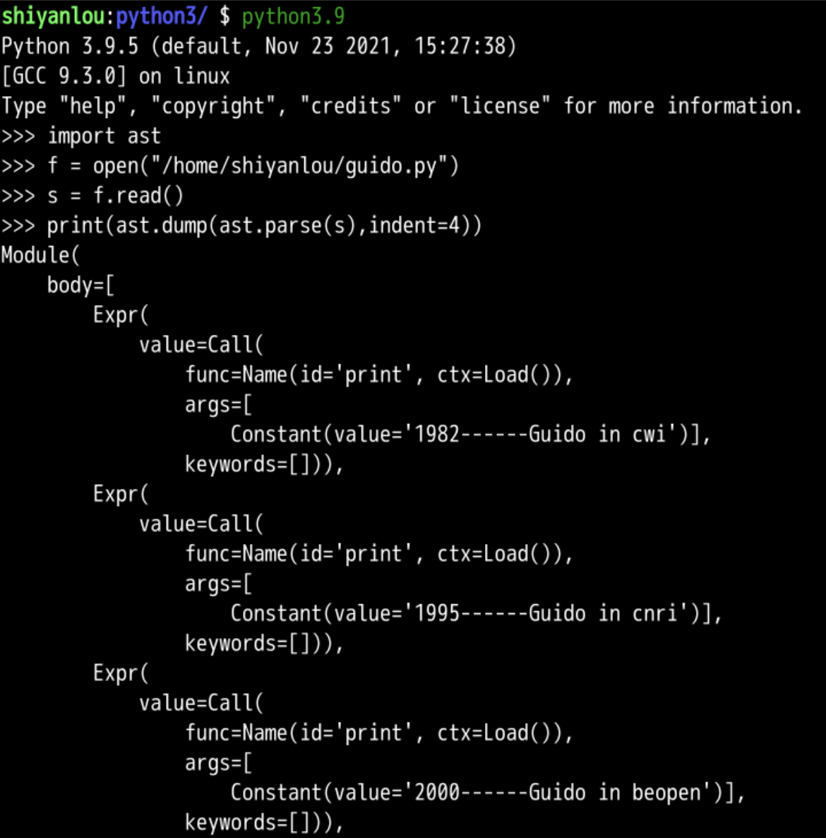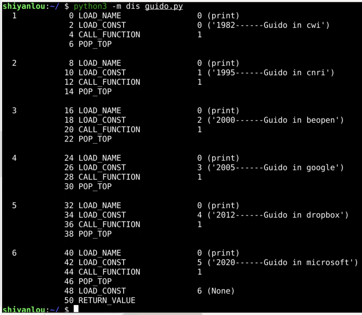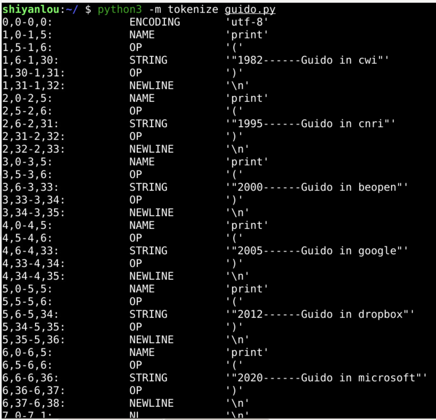 print("1982------Guido in cwi") print("1995------Guido in cnri") print("2000------Guido in beopen") print("2005------Guido in google") print("2012------Guido in dropbox") print("2020------Guido in microsoft")