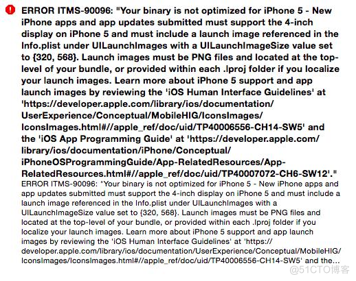 这是最常见的问题,据说是苹果的bug。明明LaunchImage里有iphone5的启动图片,但还是报错。可以按以下方法解决 1.添加一张启动图片到项目的根目录,尺寸为320*568,格式为png,命名为Default-568.png。