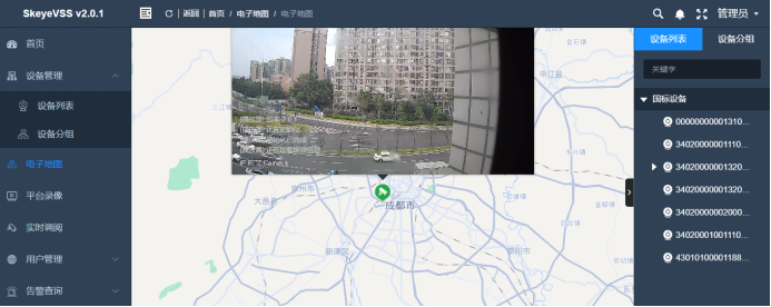 GPS/北斗定位。前端设备支持GPS/北斗定位,只要设备在线,就可以通过4G无线网络实时向SkeyeVSS系统上传设备位置信息,基于GIS地图的指挥调度,通过地理信息系统实现对各项视频资源的一体化管理,实现监控图像的直观可视化展示。