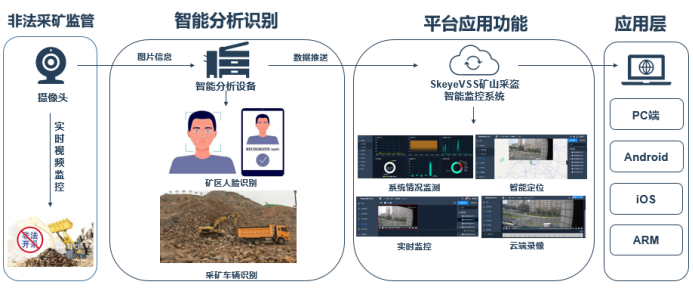 实时全天候监控矿山盗采行为。SkeyeVSS系统基于智能摄像头实时监控和识别实现对矿山盗采易发多发区域24小时监控全覆盖,对非法开采行为可实现动态监控,并实现对违法行为全过程记录、可视执法取证管理应用,真正实现对非法盗采行为的智能化有效监管。