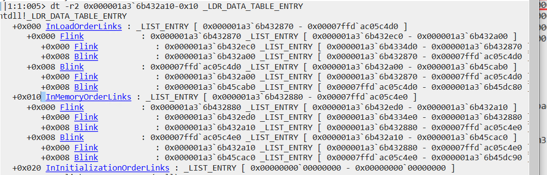 dt -r1 00007ffdac05c4c0 _PEB_LDR_DATA