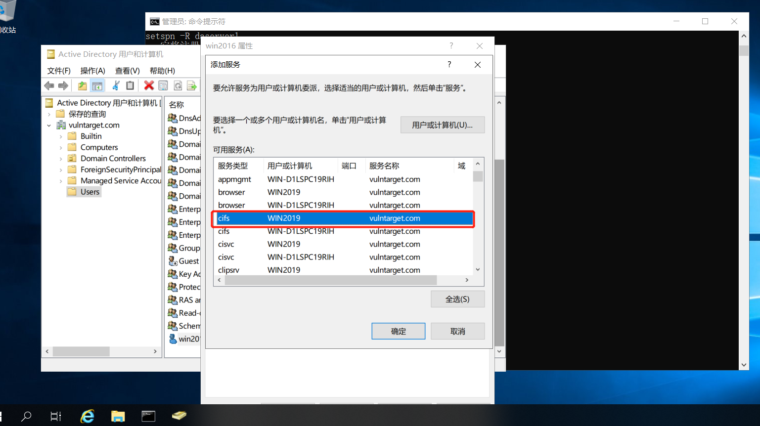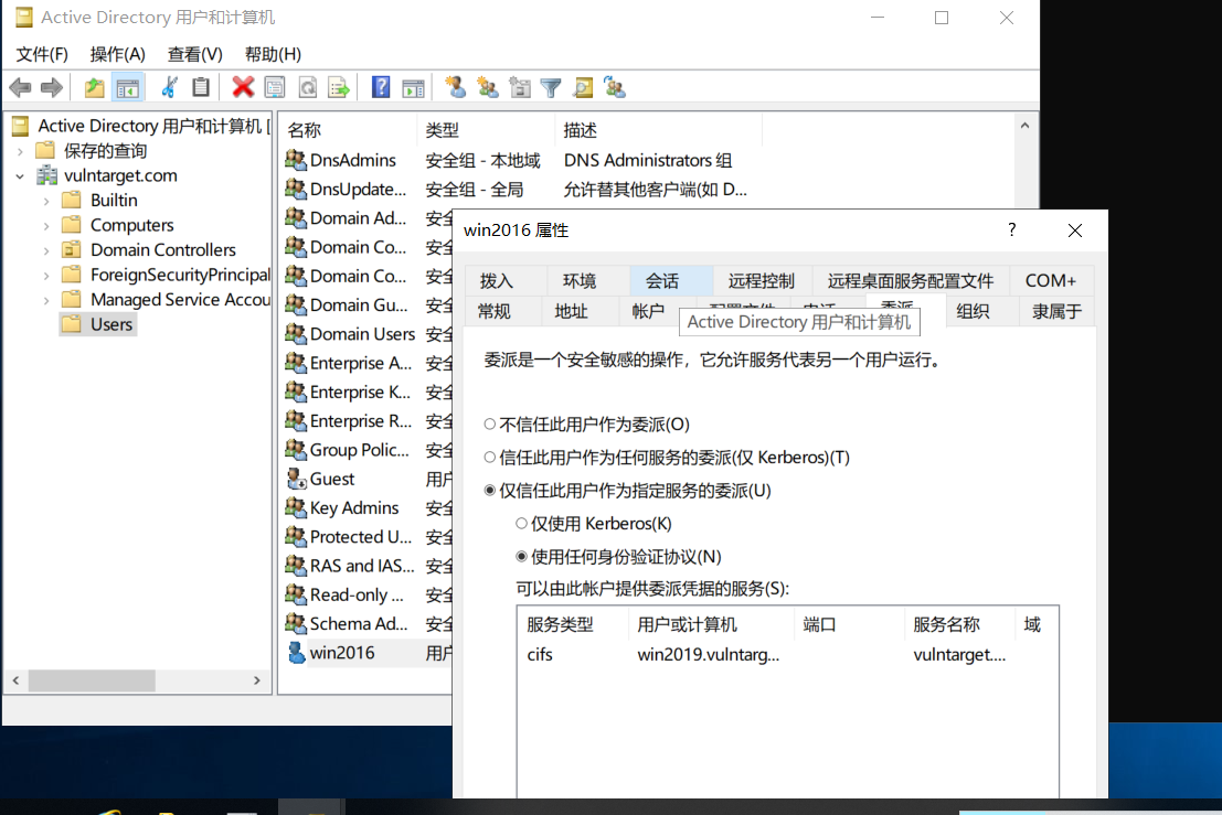 为win2016用户配置约束委派,做win2 019机器的cifs服务的委派