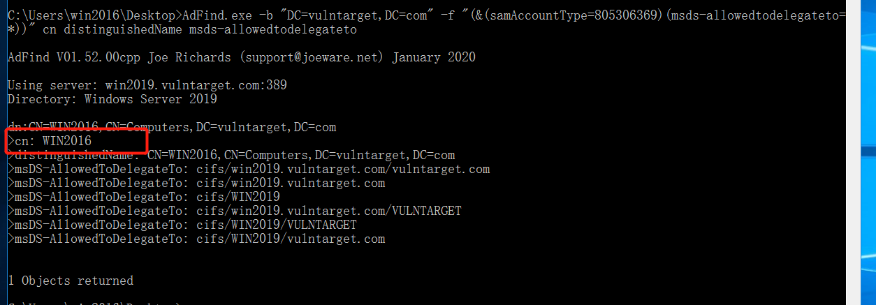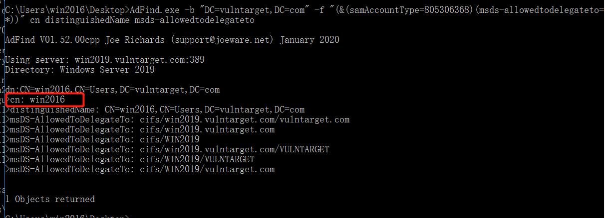 AdFind.exe -h 10.0.10.110 -u vulntarget\win2019 -up admin#123 -b "DC=vulntarget,DC=com" -f "(&(samAccountType=805306368)(msds-allowedtodelegateto=*))" msDS-AllowedToDelegateTo