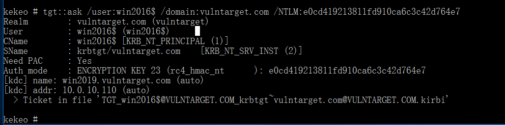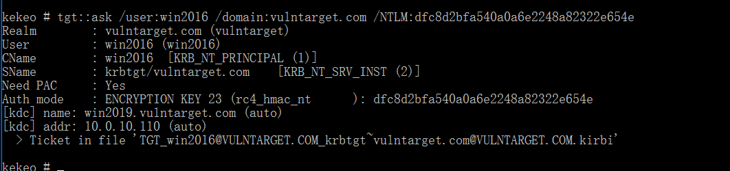 kekeo # tgt::ask /user:win2016 /domain:vulntarget.com /password:Admin#123