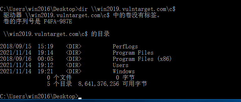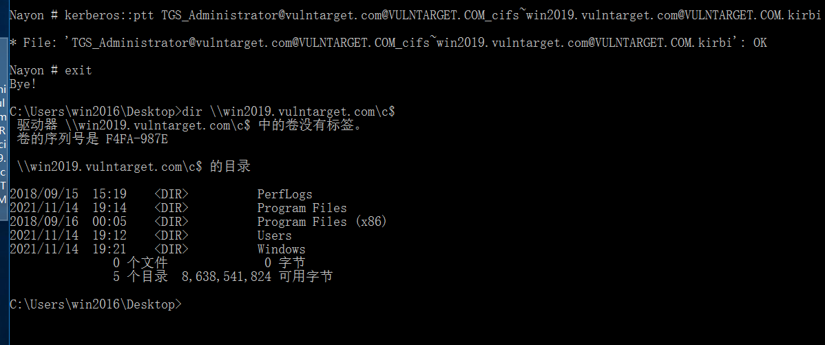 注: 此处进行tgs::s4u伪造时,申请的service是cifs/win2019.vulntarget.com时;我们在使用时就应该是dir \win2019.vulntarget.com\c$ 这样才能访问成功,若dir \win2019\c$则会访问失败,反之亦然!
