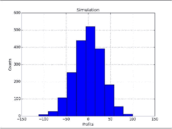 profits[i] = sells.sum() - buys.sum()绘制大量模拟的利润直方图: