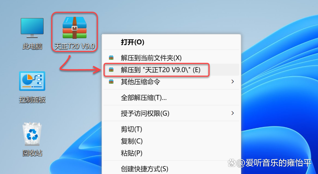 1.鼠标右击【天正T20 V9.0】压缩包(win11及以上系统需先点击“显示更多选项”)选择【解压到 天正T20 V9.0】。
