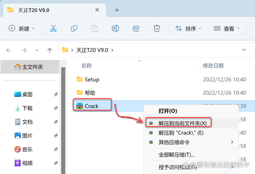 9.打开安装包解压后的【天正T20 V9.0】文件夹,鼠标右击【Crack】选择【解压到 当前文件夹】。