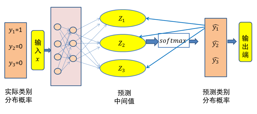 可以看出,$Softmax$和交叉熵损失函数相互结合,为偏导计算带来了极大便利。偏导计算使得损失误差从输出端向输入端传递,来对模型参数进行优化。在这里,交叉熵与Softmax函数结合在一起,因此也叫 $Softmax$损失(Softmax with cross-entropy loss)。