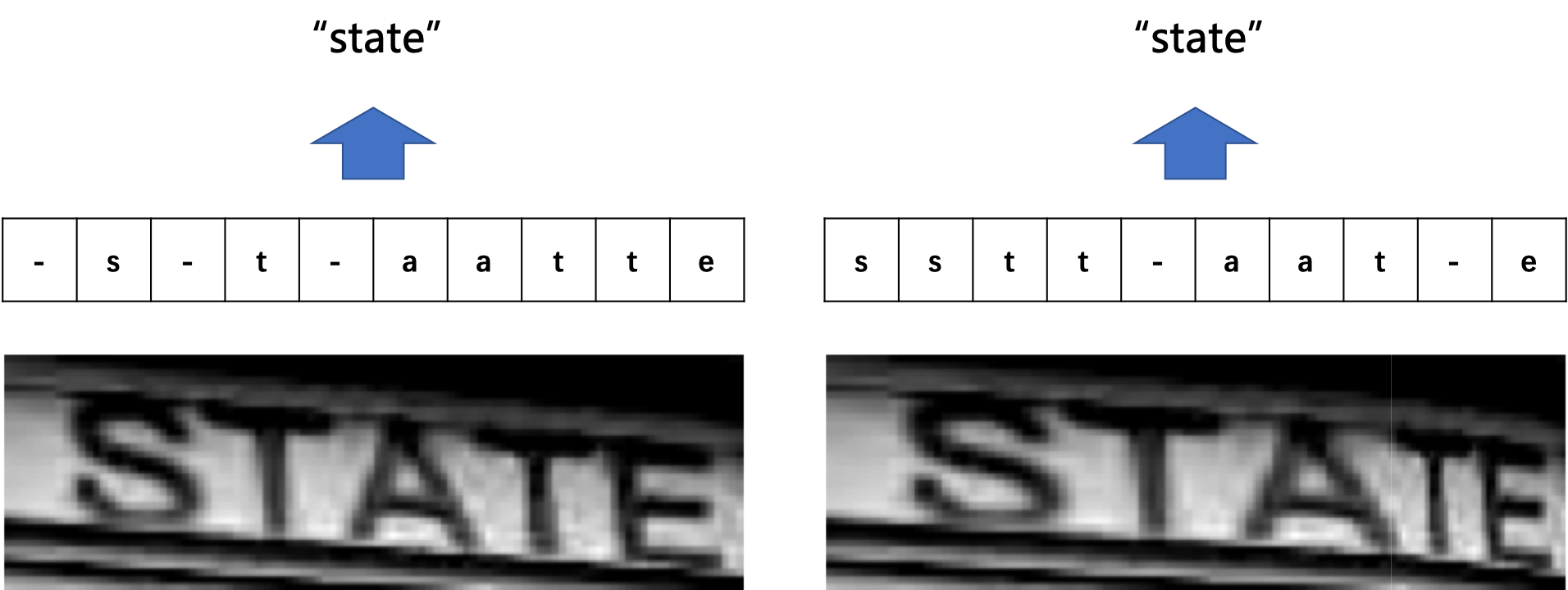 在文本识别领域,由于字符间隔、图像变形等问题,相同的字符也会得到不同的预测结果,所以同样会会遇到标签和预测值无法对齐的情况。如 图2 所示。