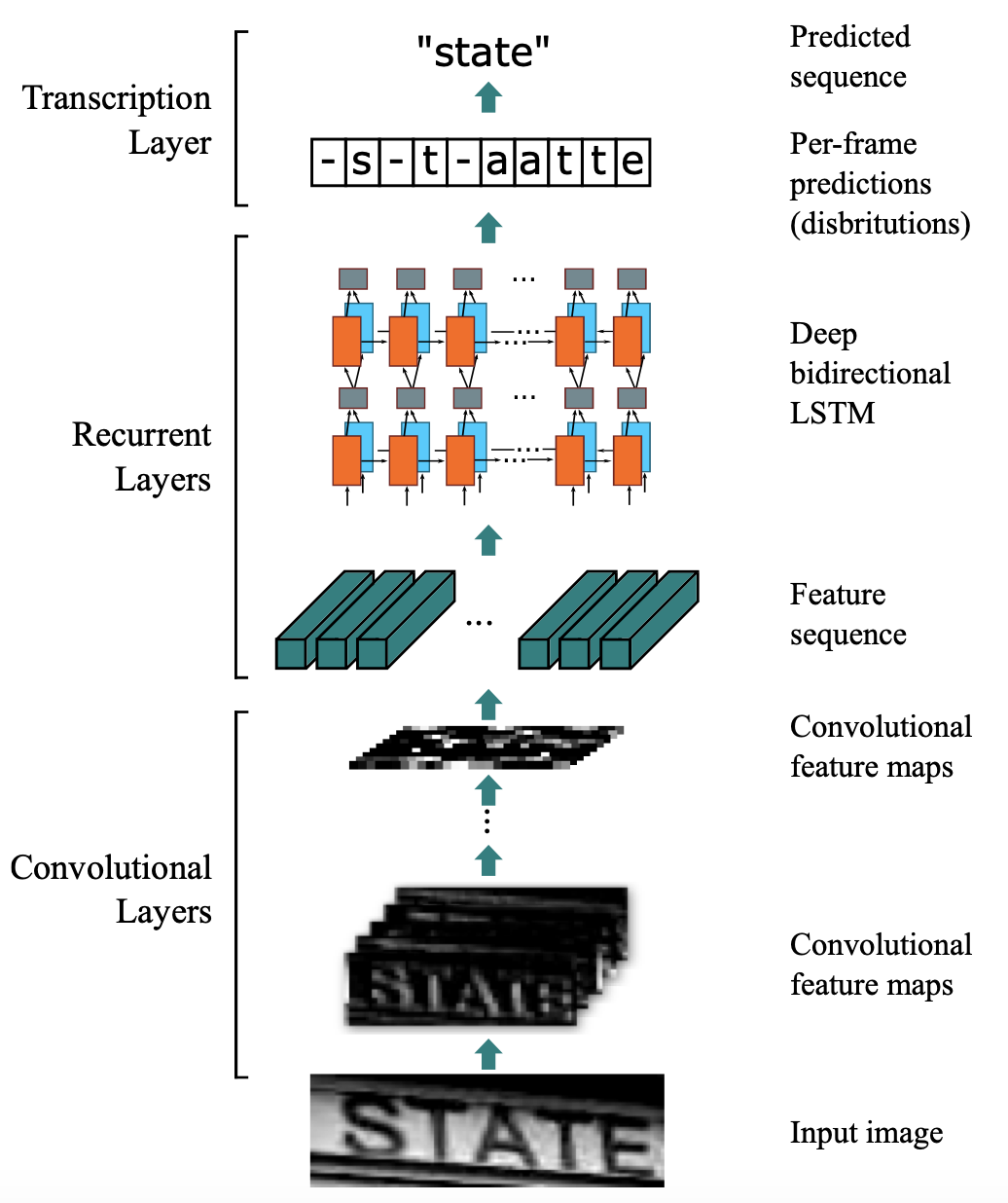 引入CTC主要就是要解决上述问题。这里以文本识别算法CRNN为例,分析CTC的计算方式及作用。CRNN中,整体流程如 图3 所示。