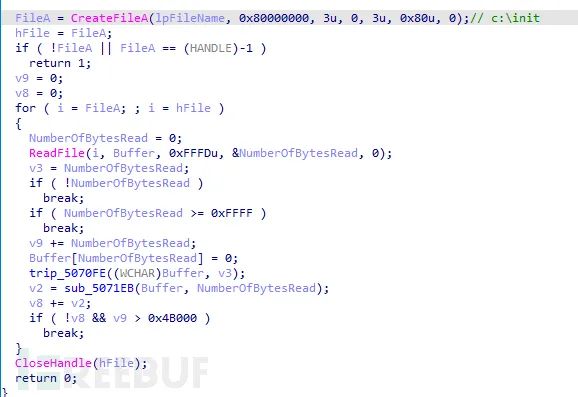 继续主线程往下分析,样本会打开c盘根目录下的init文件,读取里面的文件,但我主机上没有此文件,对于他要做啥也是不明所以。