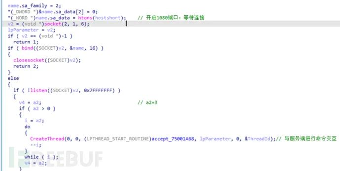 样本会开启本地的1080端口等待服务端的连接: