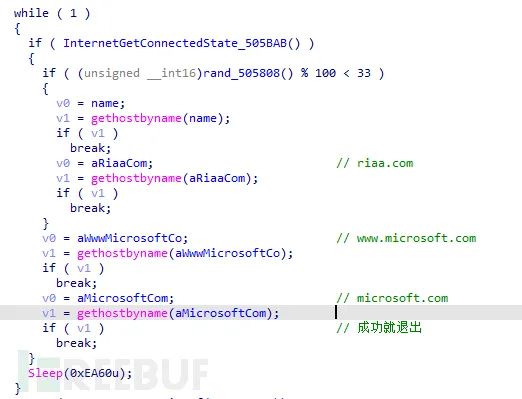 首先获取网络连接状态,并且通过三个白域名判断网络是否可用,如果网络不可用便会陷入死循环: