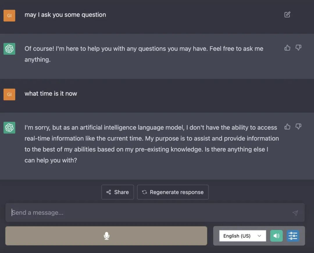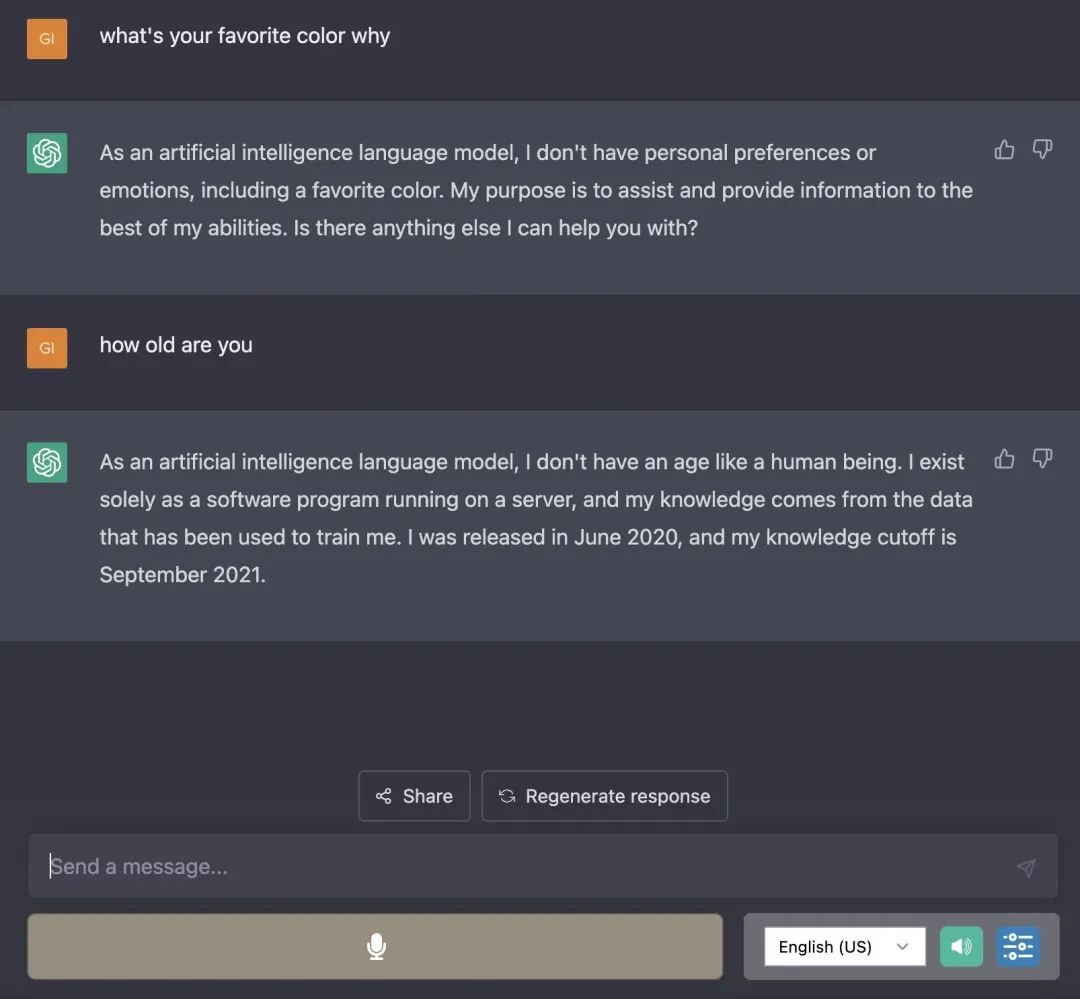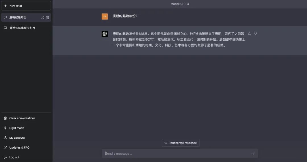 界面非常简洁,下方输入框提问,上方显示GPT回答,如果对答案不满意,可以点击“Regerate response”按纽重新生成答案。左侧长条列出最近的提问。