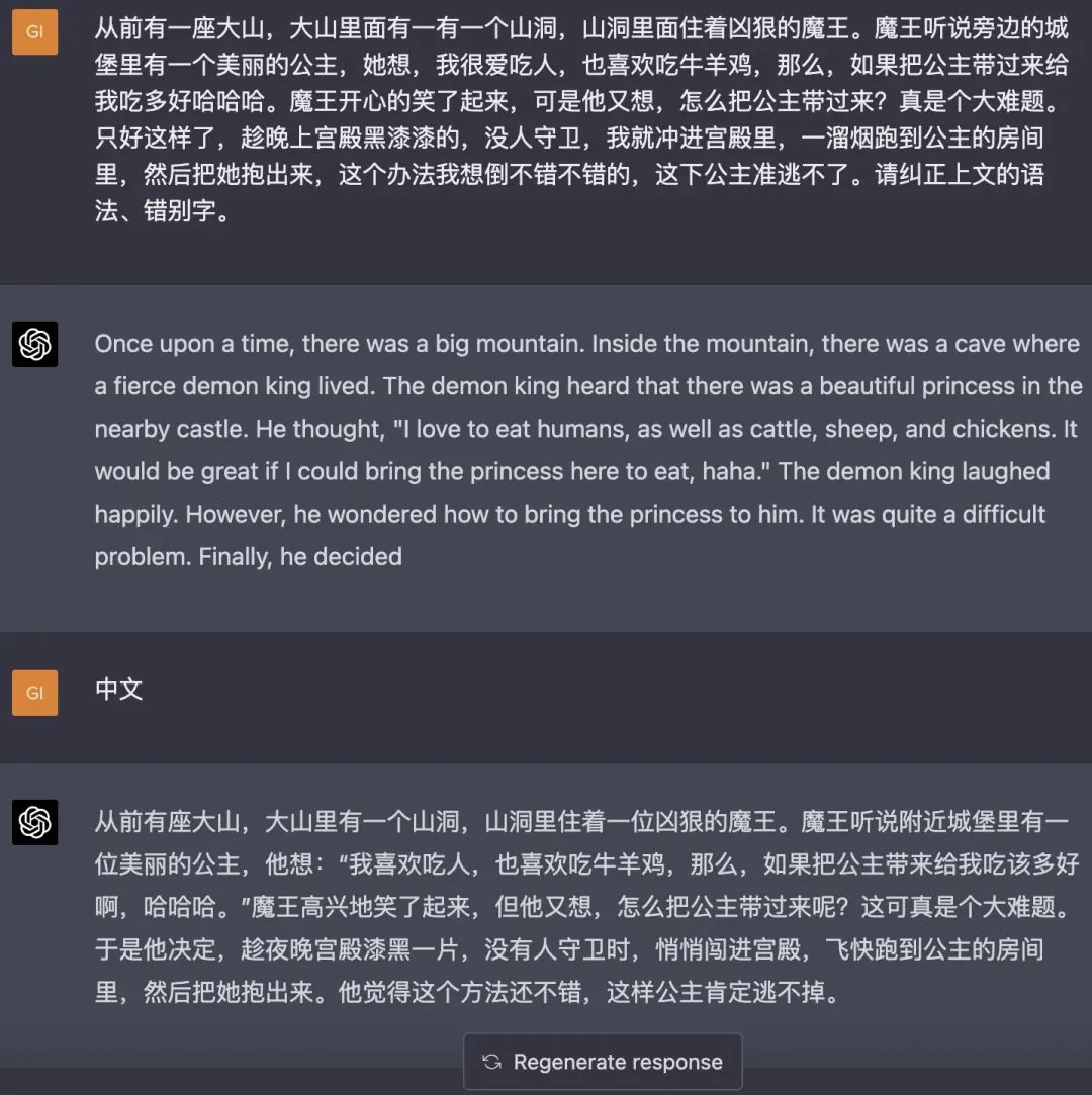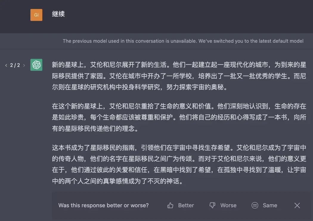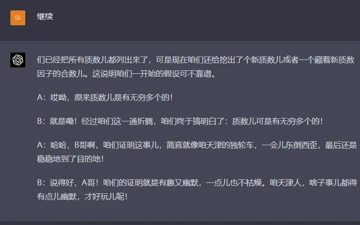 评论:如果回答超过1000字,会暂停生成,可以发送“继续”,让GPT继续生成。可惜触发了GPT4的3小时25条的限制,需要等待或者使用GPT3.5。
