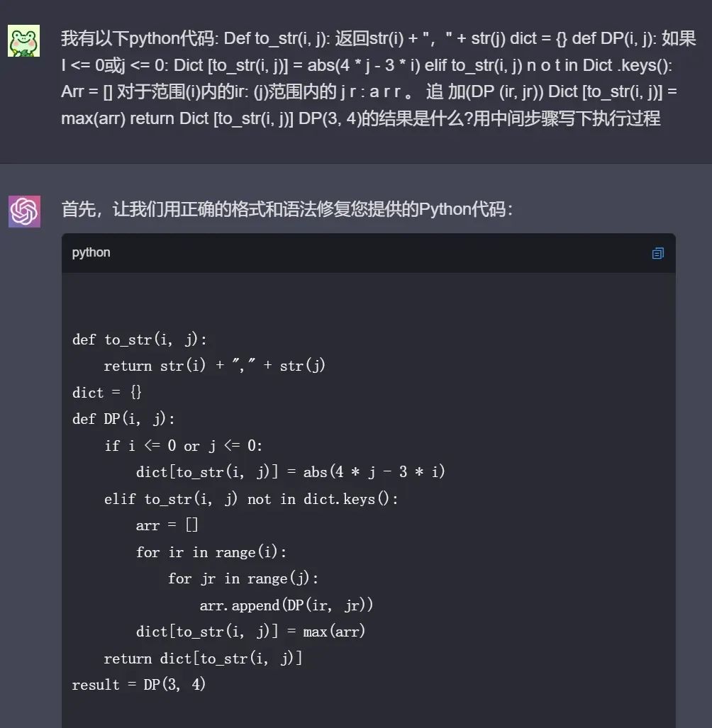 评论:GPT-4能够执行Python代码。它必须跟踪几个变量(包括一个嵌套循环和一个字典)并处理递归。它通过编写中间步骤和注释来详细解释执行过程。需要注意的是,GPT-4并不是在Python解释器上运行代码,而是用自然语言模拟代码。这需要对代码有高度的理解和推理能力,以及清楚地传达结果的能力。